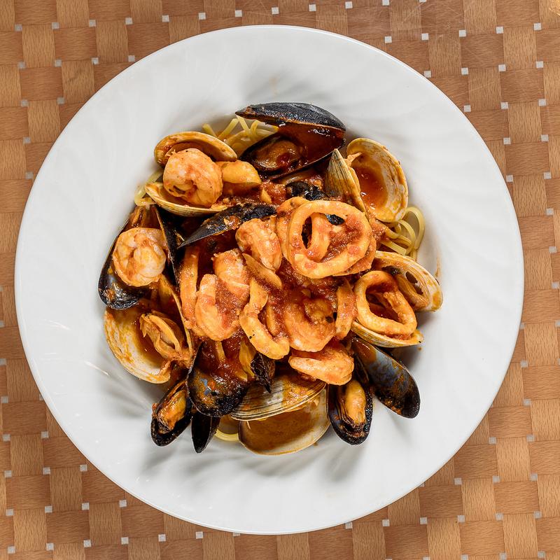 Calamari, clams, shrimp, mussels & cream garlic wine sauce over linguini.