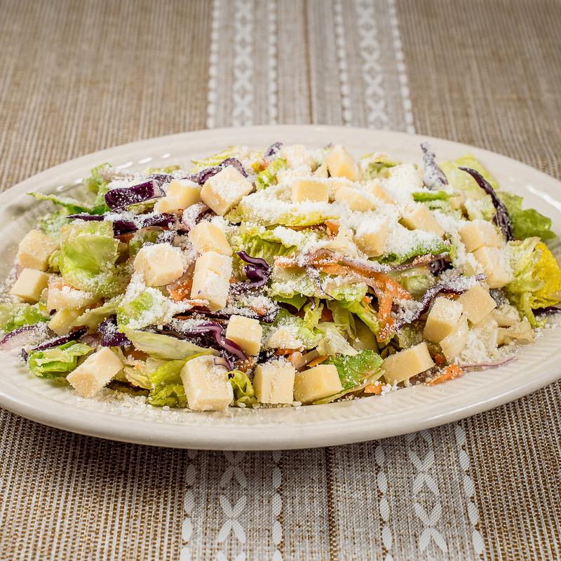 Iceberg, romaine, shredded carrots, tomatoes, onions, Italian provolone cheese, grated parmesan, red cabbage, and EVOO.