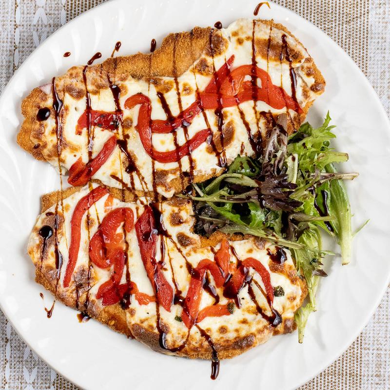 Panko-crusted, melted fresh mozzarella, roasted peppers & balsamic glaze, served with mixed greens.